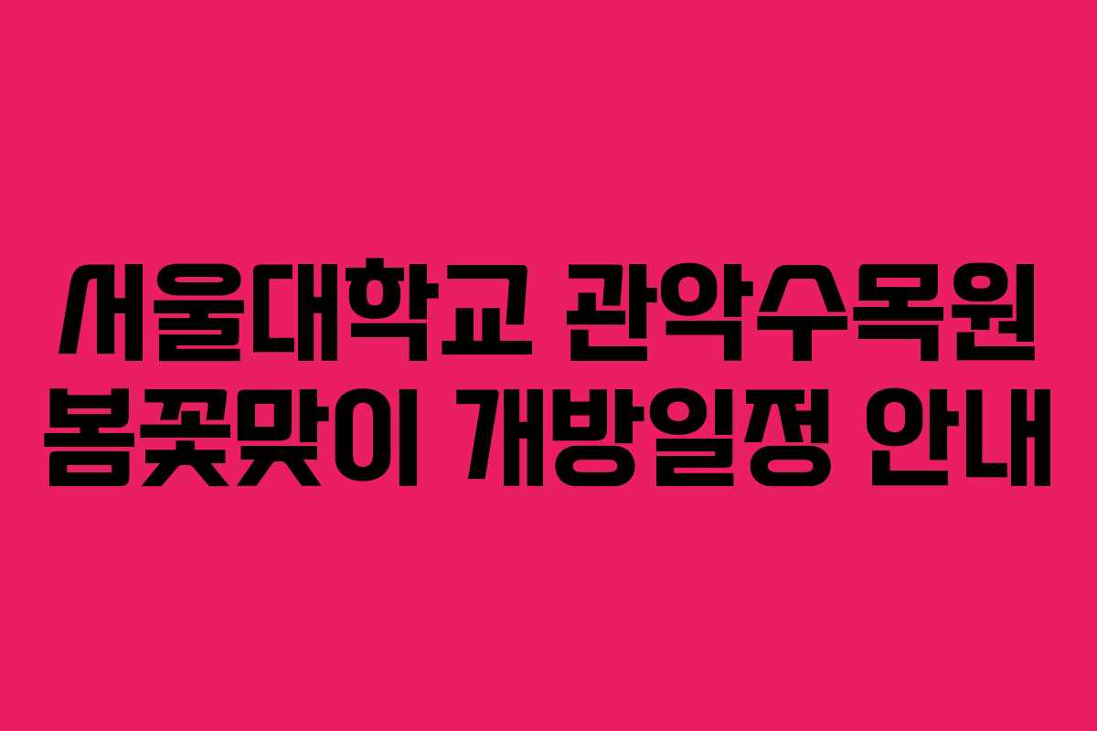 2026년 서울대학교 관악수목원은 4월 15일부터 5월 7일까지 개방합니다. 운영 시간은 오전 9시부터 오후 5시 30분까지이며, 마지막 입장은 오후 5시에 마감됩니다.