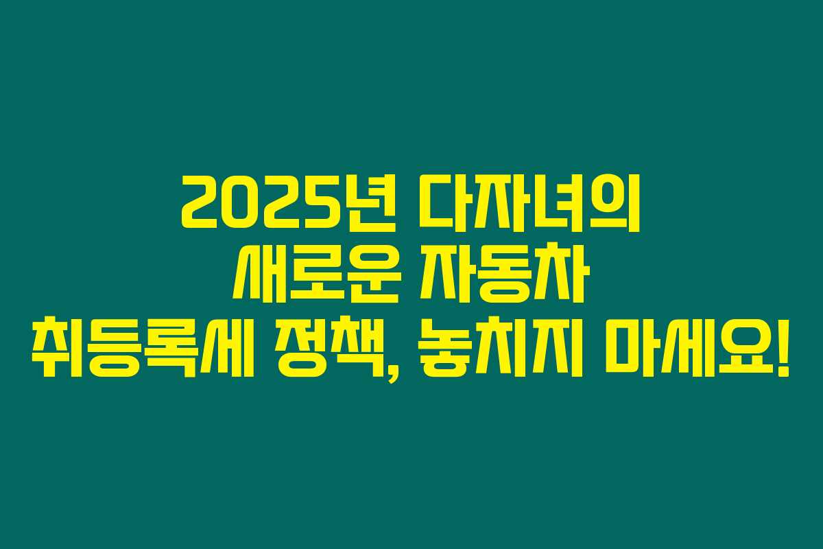 제가 직접 리서치해본 결과로는, 2025년부터 다자녀 가구의 자동차 취등록세가 새로운 기준으로 감면될 예정입니다. 다자녀 가구의 정의가 기존 3자녀에서 2자녀 이상으로 완화되면서, 많은 가정이 혜택을 볼 수 있게 됩니다. 아래를 읽어보시면 다자녀 가구에 대한 자동차 취등록세 감면 혜택에 대해 명확히 이해할 수 있을 것입니다.