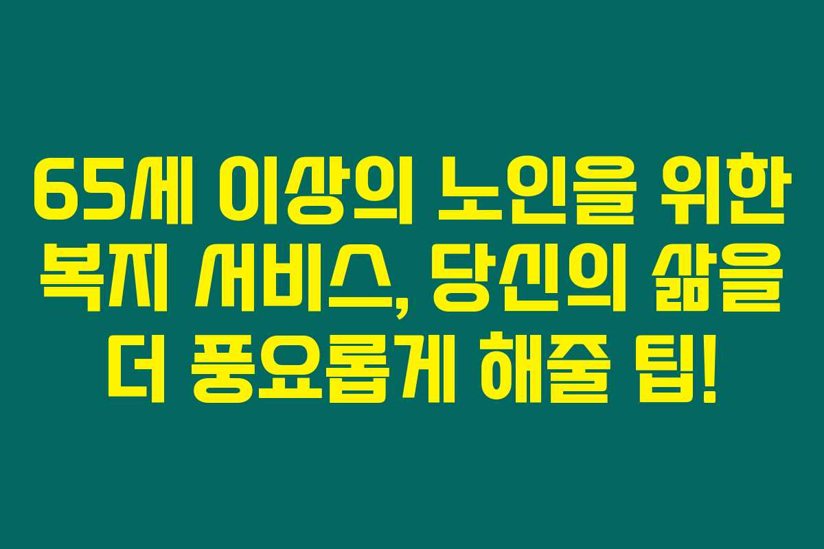 제가 직접 알아본 바로는, 65세 이상의 노인들은 우리 사회에서 중요한 역할을 해오셨습니다. 그렇기 때문에 다양한 복지 서비스가 제공되어 그들의 삶의 질을 높이는 데 기여하고 있습니다. 아래를 읽어보시면, 노인 분들이 누릴 수 있는 여러 혜택과 복지 서비스에 대해 자세히 알 수 있습니다.