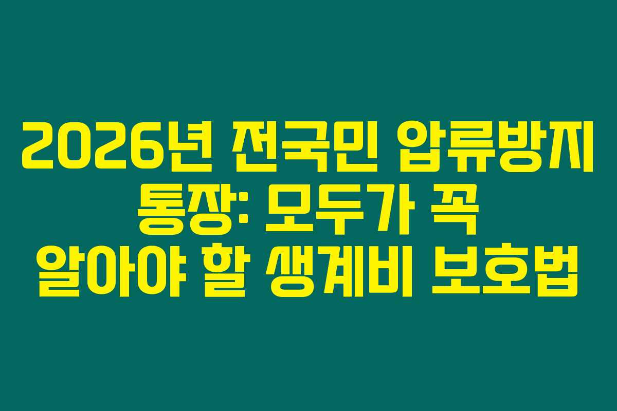 2026년부터 시행되는 전국민 압류방지 통장은 모든 대한민국 국민의 생계비를 보호해주는 혁신적인 제도입니다. 기존의 복잡한 조건 없이, 신고하신 통장에서 월 185만 원까지 압류로부터 안전하게 지켜 줍니다. 아래를 읽어보시면 이 통장이 어떻게 여러분의 삶에 긍정적인 영향을 미칠 수 있을지 궁금증이 풀리실 거예요.
