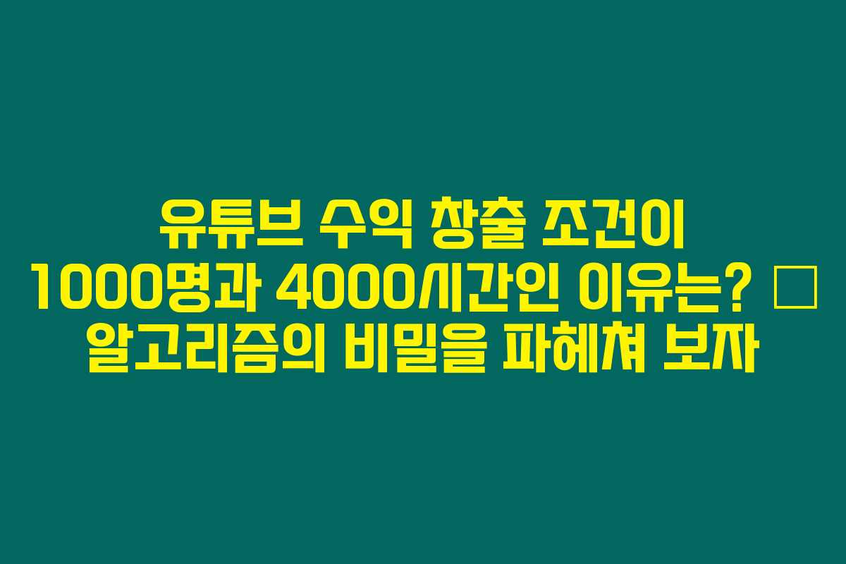 유튜브의 수익 창출 요구 조건인 구독자 1000명과 시청 시간 4000시간은 많은 사람들에게 궁금증을 자아내는 부분입니다. 아래를 읽어보시면, 이러한 조건이 탄생한 이유와 유튜브 알고리즘의 배경을 이해하는 데 도움이 될 것입니다.