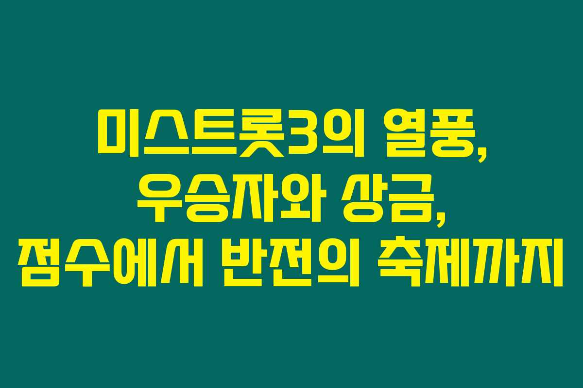 올해 가장 인기 있는 프로그램 중 하나인 미스트롯3가 드디어 성대한 결승을 마쳤어요. 무려 3개월간의 치열한 경연을 통해 어느 때보다 더 많은 실력자들이 등장해 화제를 모았지요. 과연 이번 시즌에서 누가 우승했고 어떤 점수로 결정났는지 궁금한 분들이 많을 텐데요. 그럼 미스트롯3의 우승자와 함께 상금, 점수, 그리고 전체 순위를 알아보도록 할게요.